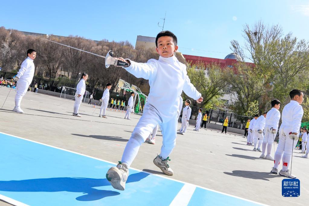 4月26日,学生在开幕式上展示击剑。新华社记者 王菲 摄(王菲)