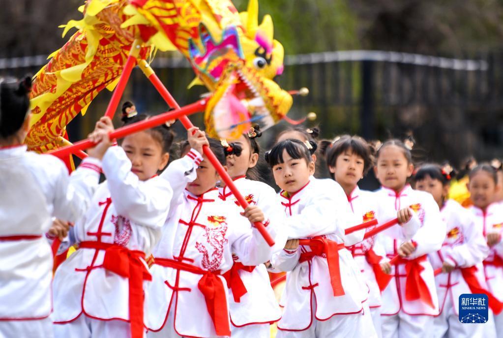 4月26日,学生在开幕式上展示舞龙。新华社记者 王菲 摄