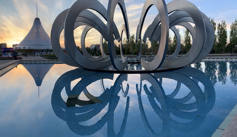 ↑哈萨克斯坦首都阿斯塔纳的雕塑和远处的“可汗之帐”购物中心。
