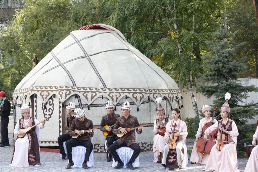 ↑身穿民族服饰的演奏者在吉尔吉斯斯坦首都比什凯克用传统乐器合奏音乐。