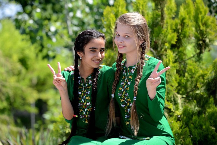 ↑土库曼斯坦首都阿什哈巴德街头的当地女孩。