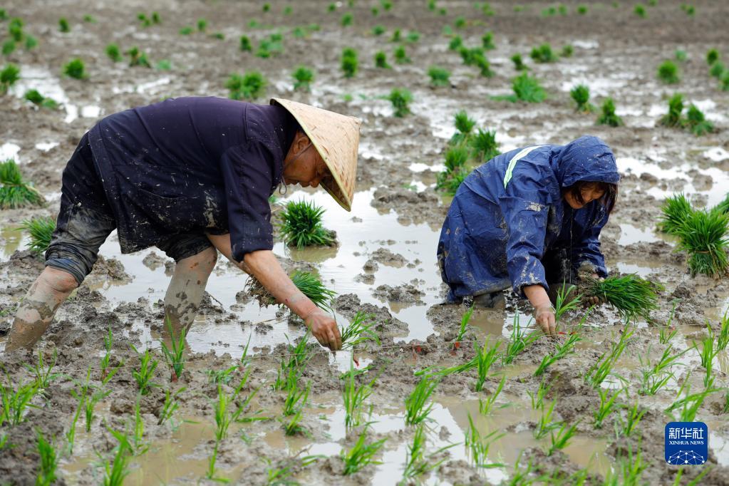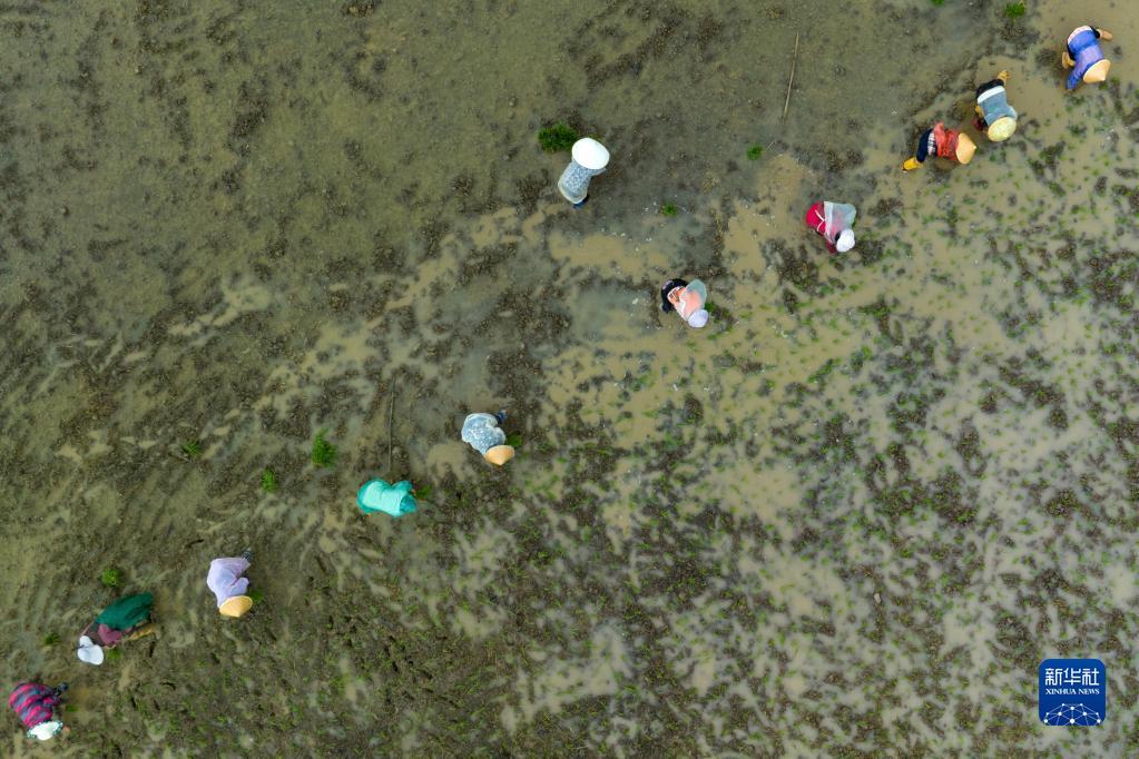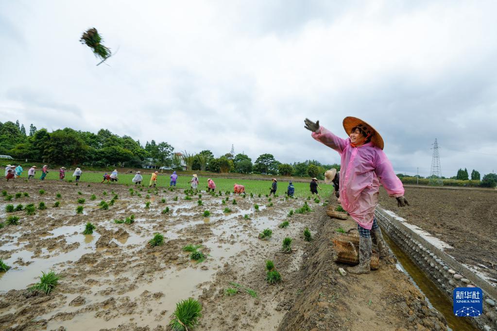 5月9日,在四川省崇州市道明镇协和社区,农民向一片高标准农田里抛水稻秧苗,以方便其他农民插秧。