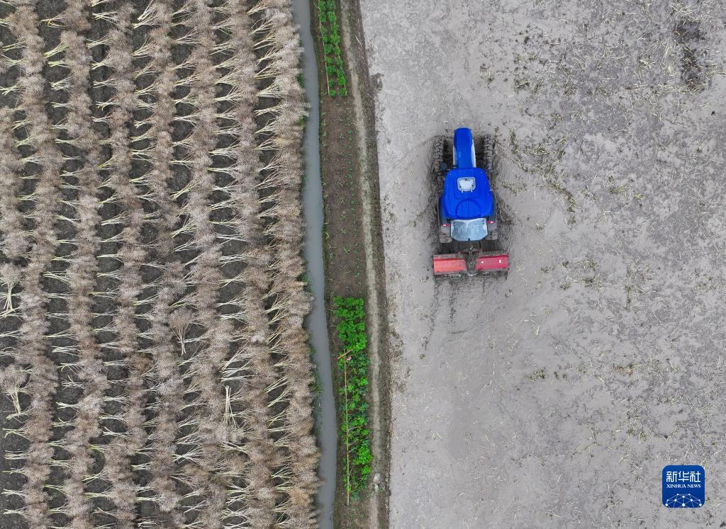 5月9日,四川省邛崃市桑园镇农民驾驶拖拉机进行打浆作业。