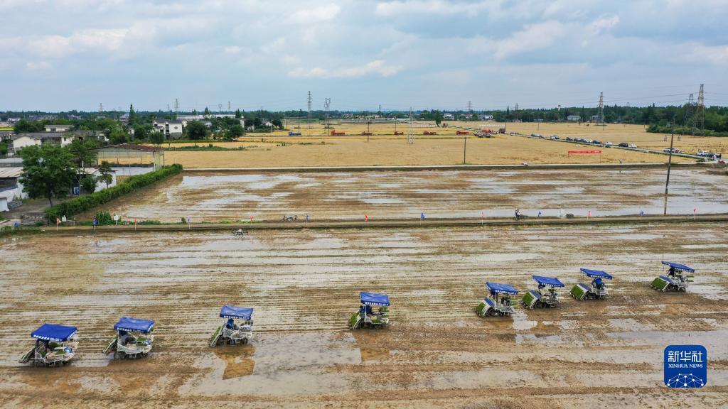 5月10日,在四川省崇州市天府粮仓国家现代农业园区,农民驾驶农机抢种水稻(无人机照片)。