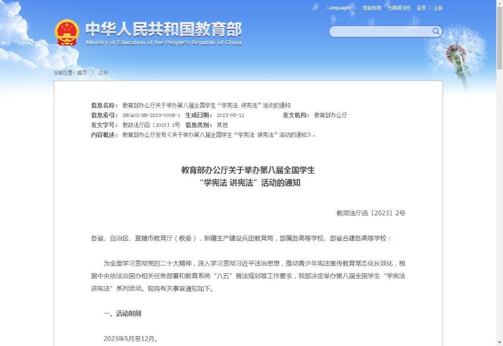 记者5月19日从教育部获悉,今年5月至12月,教育部将举办第八届全国学生“学宪法 讲宪法”系列活动,要求各地各校建立宪法宣传教育常态化长效化机制,有条件的地方要将法治实践教育纳入中小学课后服务范围,推动学生每年接受不少于2课时的法治实践教育。