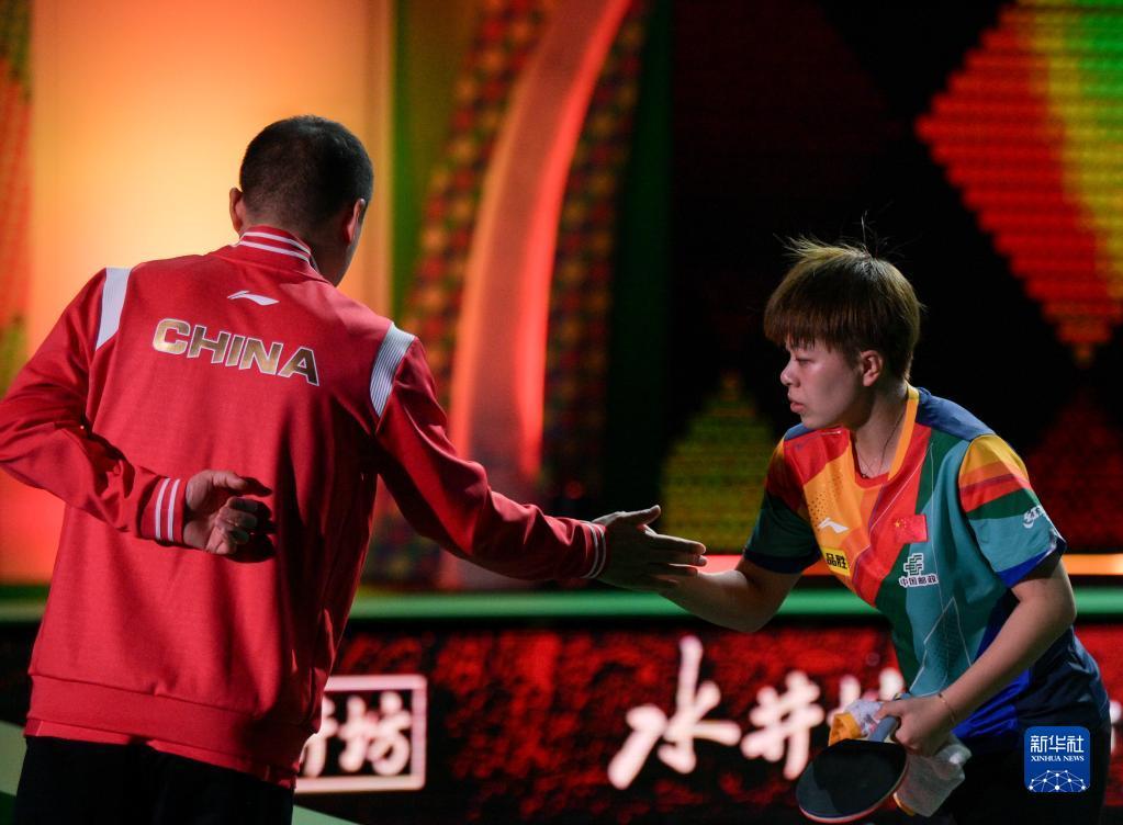 5月21日,王艺迪(右)在比赛后和女队主教练马琳握手致意。新华社记者 韩旭 摄