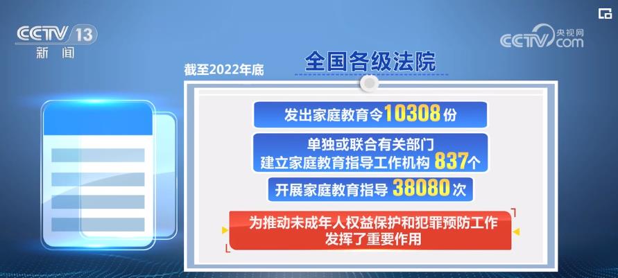 最高法介绍,2022年1月1日《家庭教育促进法》实施后,全国各级法院迅速贯彻落实,开展家庭教育指导工作,积极探索专业化、规范化工作机制,取得了一定成效。经初步统计,截至2022年底,全国各级法院发出家庭教育令10308份,单独或联合有关部门建立家庭教育指导工作机构837个,开展家庭教育指导38080次,为推动未成年人权益保护和犯罪预防工作发挥了重要作用。
