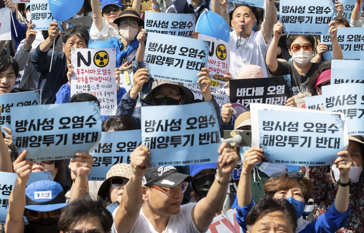 5月20日,韩国多个市民团体在首尔市中心举行集会,强烈反对日本政府将福岛核污染水排入大海计划。