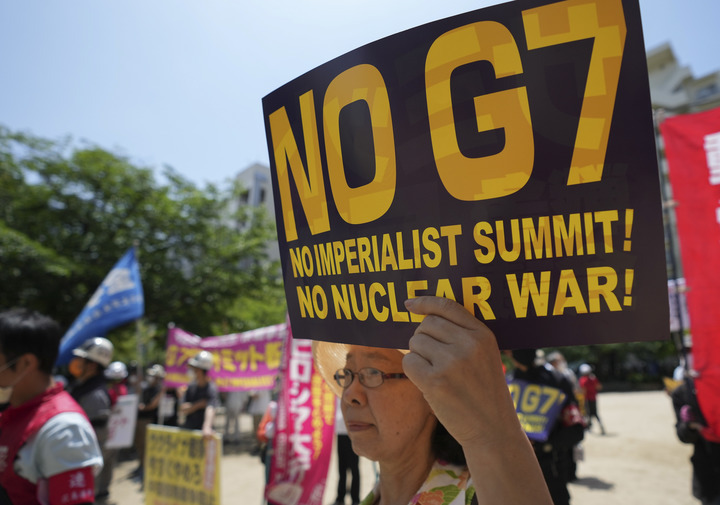 5月21日,民众聚集在日本广岛袋町公园,抗议七国集团峰会。新华社记者张笑宇摄