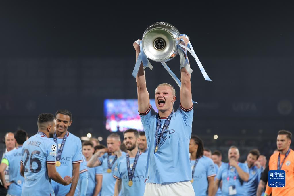 6月10日,曼彻斯特城队球员哈兰德捧杯庆祝。新华社发