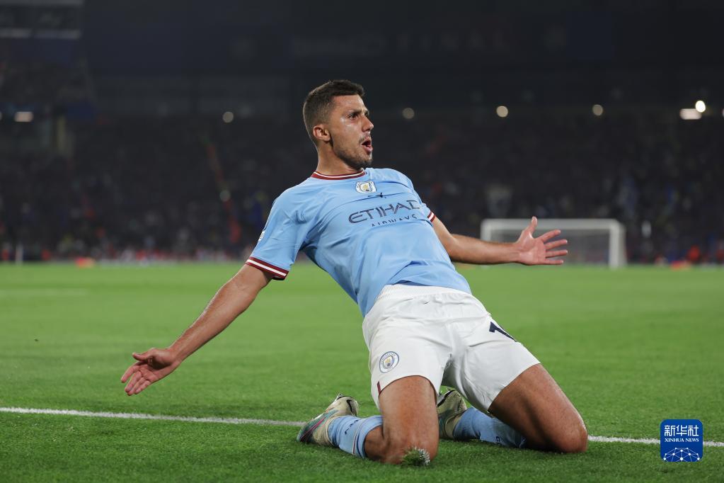 6月10日,曼彻斯特城队球员罗德里·埃尔南德斯在进球后庆祝。新华社发