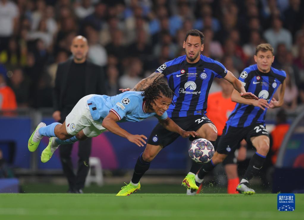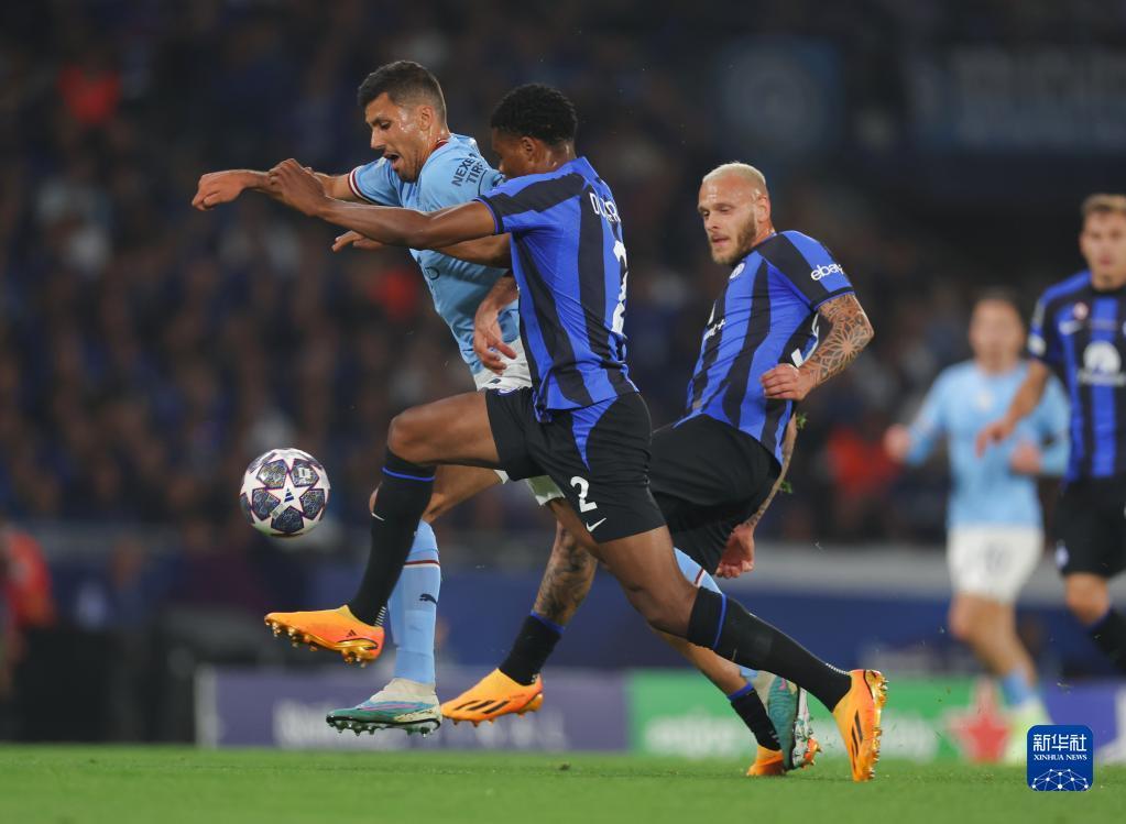 6月10日,曼彻斯特城队球员罗德里·埃尔南德斯(左)与国际米兰队球员邓弗里斯(中)在比赛中拼抢。新华社发