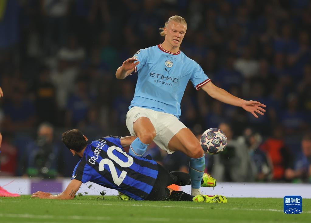 6月10日,曼彻斯特城队球员哈兰德(上)与国际米兰队球员恰尔汗奥卢在比赛中拼抢。新华社发
