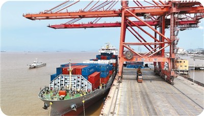 浙江省玉环市通过整合港口仓储、外贸、集装箱运输等多种业务类型,增强港口对RCEP国家的辐射能力。图为大麦屿港码头的工人正忙着将集装箱载入开往日本大阪等地的货轮。 段俊利摄(人民视觉)