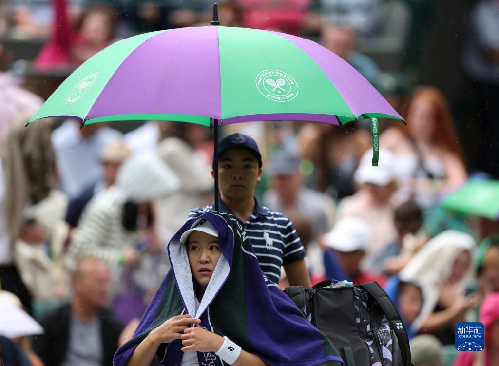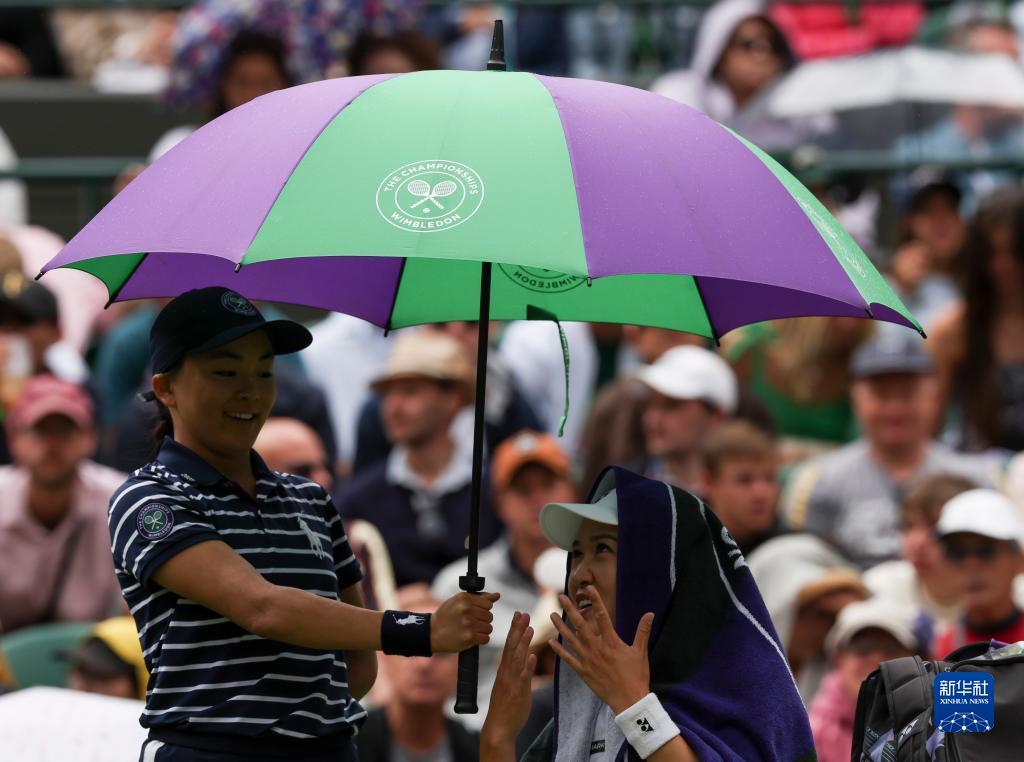 7月3日,朱琳(下)在比赛中用毛巾挡雨。新华社记者 韩岩 摄