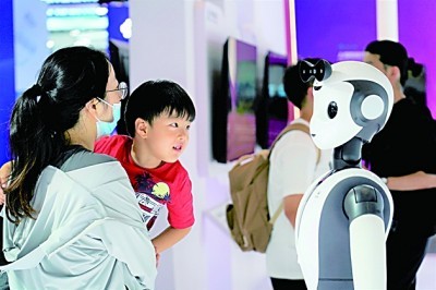 7月6日,参观者在达闼展位与柔美人形智能服务机器人互动。新华社发(李心怡摄)