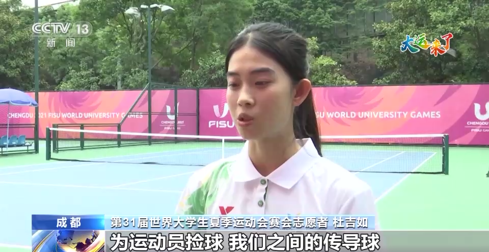 第31届世界大学生夏季运动会赛会志愿者 杜吉如:我们是赛事志愿者,为运动员捡球,我们之间的传导球,为运动员拿毛巾、水,还有一些擦地工作。今天是我们第一天上岗,大家也都很努力,争取在大运会的时候服务好运动员。