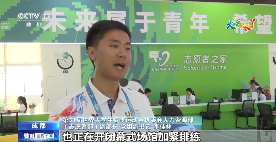 第31届世界大学生夏季运动会执委会人力资源部(志愿者部)副部长 党组副书记 李佳林:最近随着我们的世界各国代表团陆续抵达成都,我们350名代表团随员志愿者已经开始上岗。另外,我们有3000名左右的演职类志愿者也正在开闭幕式场馆加紧排练,为他们在开闭幕式的精彩表演全力以赴。所有的竞赛场馆的志愿者也都已经全部上岗,准备好迎接我们的大运会各项赛事的到来。