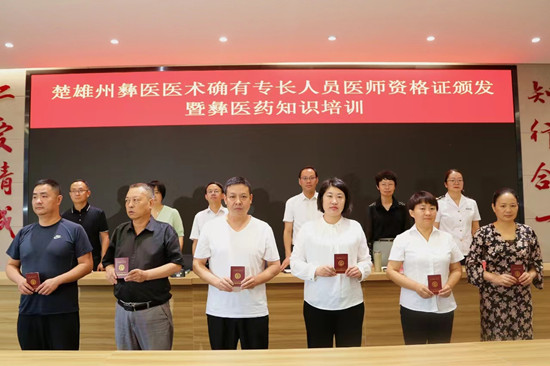 7月28日,楚雄州举行彝医医术确有专长人员医师资格证颁发仪式暨彝医药知识培训,6名考生通过严格规范的考核取得彝医医术确有专长医师资格证,在楚雄州范围内具备了合法的行医资格。