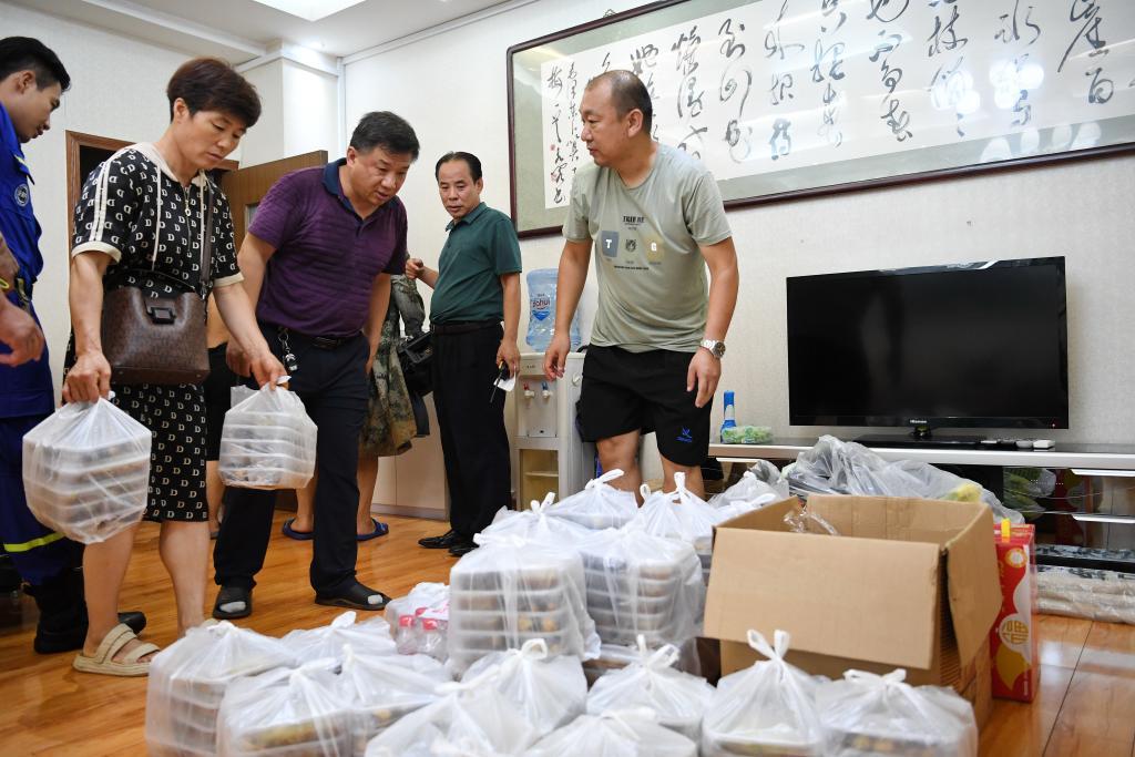 8月1日晚,河北省涿州市职业技术教育中心的工作人员正在运送饭菜,准备发放给安置群众。新华社记者 牟宇 摄