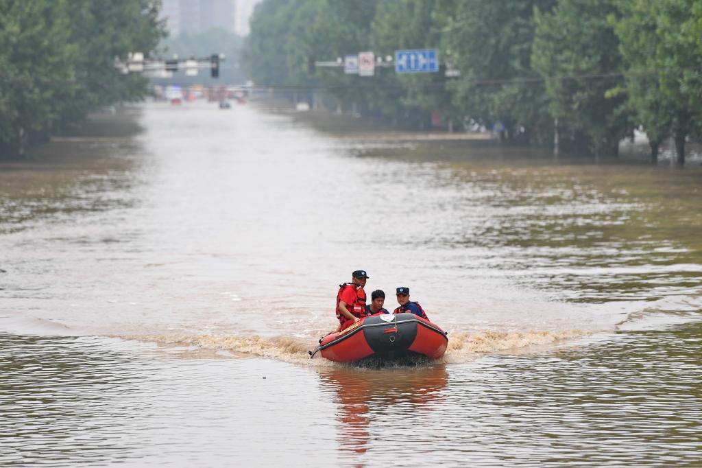 8月2日,救援人员在河北省涿州市市区内驾驶冲锋舟转移群众。新华社记者 牟宇 摄