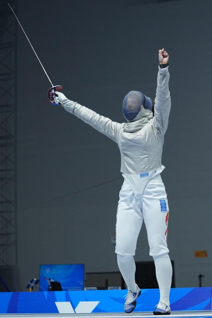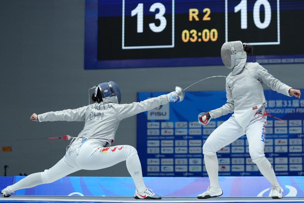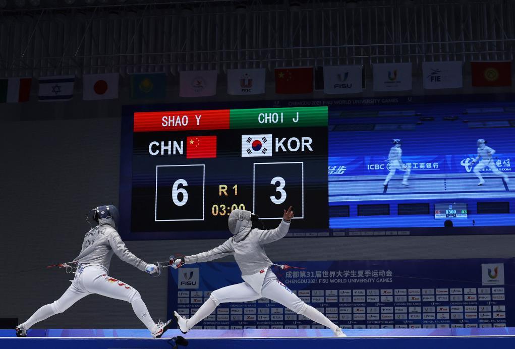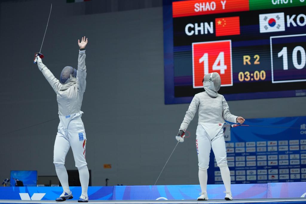 当日,在成都举行的第31届世界大学生夏季运动会击剑女子佩剑个人赛中,中国选手邵雅琦以15比10战胜韩国选手,夺得金牌。