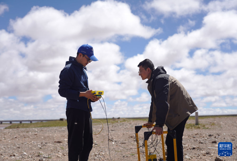 科考队员董士琦(左)和范越在长江北源楚玛尔河附近进行地质雷达探测(7月29日摄)。新华社记者 陈杰 摄