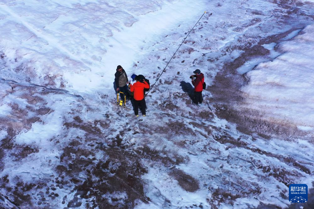 科考队员在格拉丹东雪山主峰冰川上进行地质雷达探测(7月28日摄,无人机照片)。新华社记者 刘诗平 摄