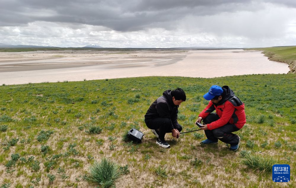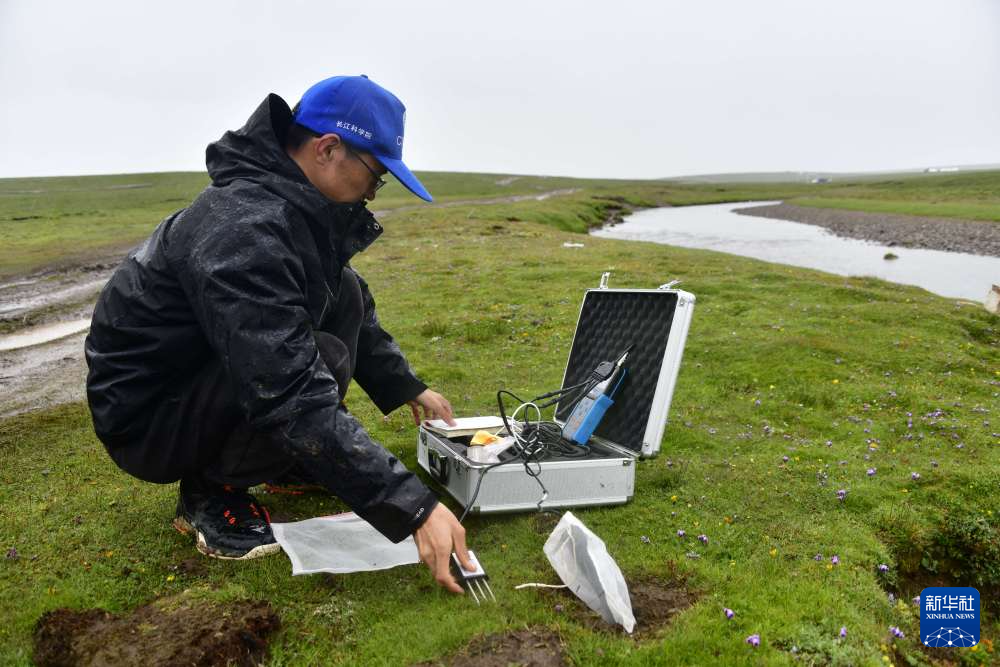 在查旦湿地,来自长江科学院空间信息技术应用研究所的科考队员张双印和队友合作,用绳子圈出一个1平方米的正方形草地样方,采集样方内的植被样品;将圆柱形环刀钉入地下,采集土壤样品。这些植被、土壤样品将被送回实验室,统一分析碳含量。