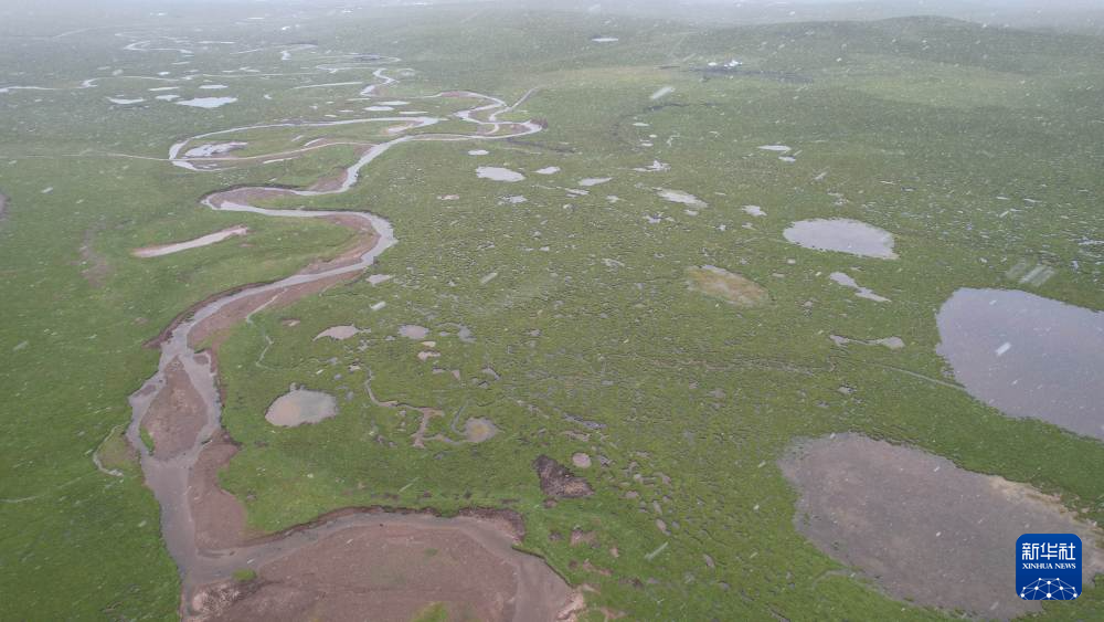 风雪弥漫中的当曲湿地(7月24日摄,无人机照片)。新华社记者 刘诗平 摄