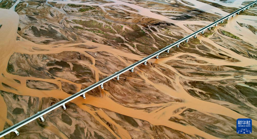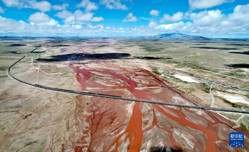 青藏铁路通过辫状河道的沱沱河(7月26日摄,无人机照片)。新华社记者 刘诗平 摄