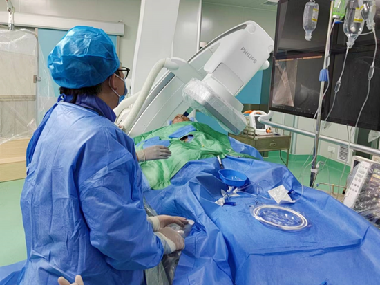 患者张某突发剧烈胸腹痛来到麒麟区人民医院就诊。急诊科医师快速准确评估病情,确诊为“急性下壁心肌梗死”。心内科医护团队迅速到位,冠脉造影显示:右冠状动脉近段完全闭塞。立即开通闭塞血管、植入支架,患者胸痛症状明显缓解,转危为安。