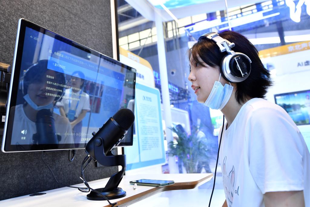 9月7日,参观者在本届数博会上体验科大讯飞AI朗读亭。新华社记者 骆学峰 摄