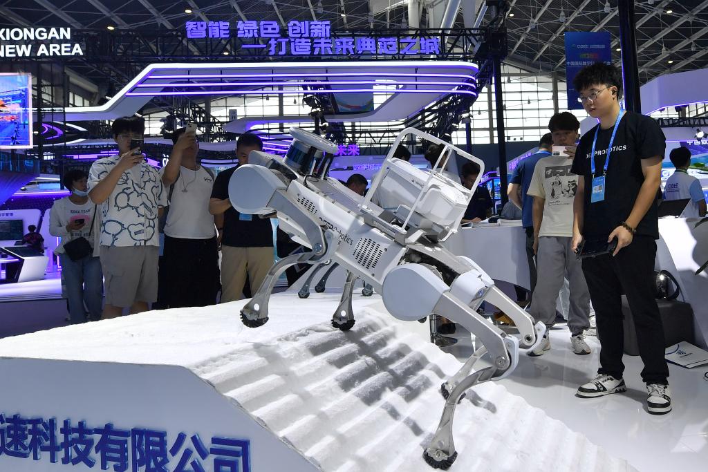 9月7日,本届数博会工作人员为参观者演示机器狗。新华社记者 骆学峰 摄
