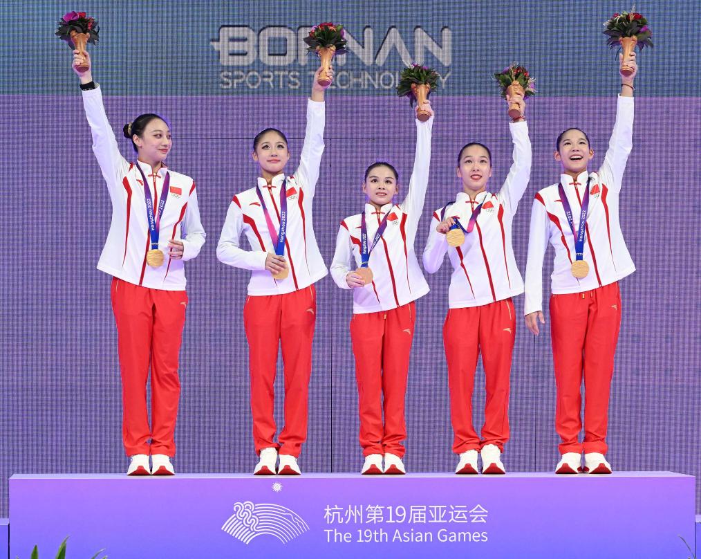 体操赛场决出女子团体金牌,由张欣怡、左彤、章瑾、虞琳敏、唐茜靖组成的中国队虽然不是最强阵容,但仍表现出高人一筹的实力,以161.896分的成绩获得该项目的亚运会13连冠。