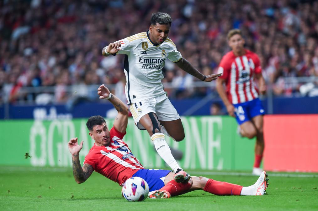 9月24日,皇家马德里队球员罗德里戈(前右)与马德里竞技队球员埃尔莫索在比赛中拼抢。新华社发(古斯塔沃·巴连特摄)