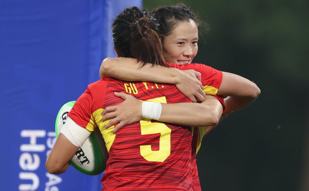 9月26日,中国队球员谷瑶瑶(左)在比赛中达阵得分后与队友王婉钰庆祝。新华社记者 贾浩成 摄