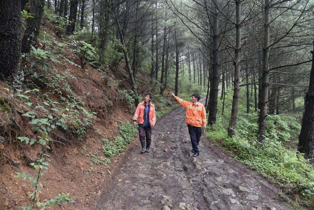 海雀村生态护林员马正安(左)和海雀村林管员王光德(右)在日常巡山护林。新华社记者 李凡 摄