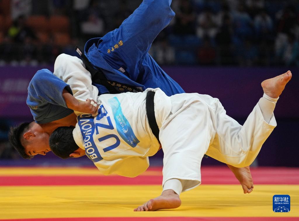 9月27日,中国选手布和毕力格(上)对阵乌兹别克斯坦选手达夫拉特·博博诺夫。