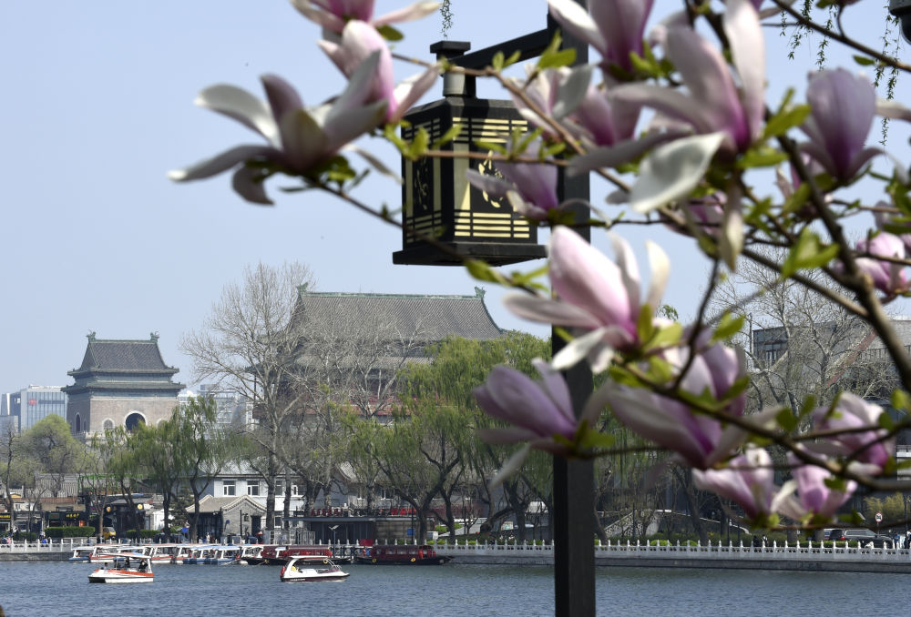 从什刹海东岸远眺北京钟鼓楼(3月31日摄)。新华社记者 罗晓光 摄
