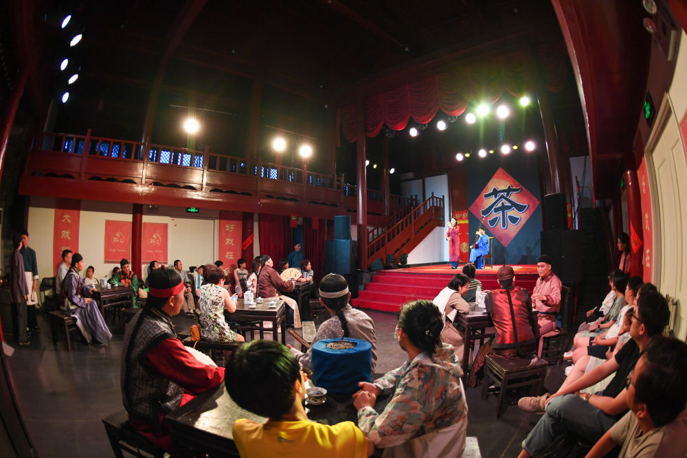 在北京市东城区颜料会馆,观众在欣赏由北京市曲剧团演员带来的沉浸式北京曲剧《茶馆》(7月7日摄)。新华社记者 鞠焕宗 摄