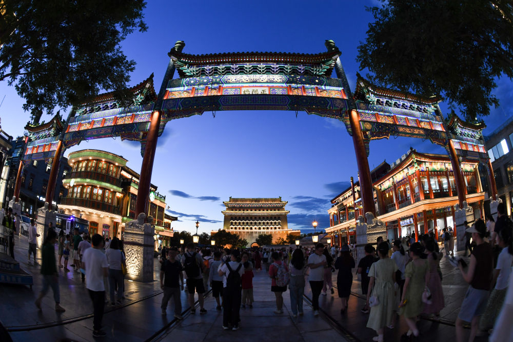 游客在位于北京中轴线的前门大街参观游览(7月8日摄)。新华社记者 鞠焕宗 摄