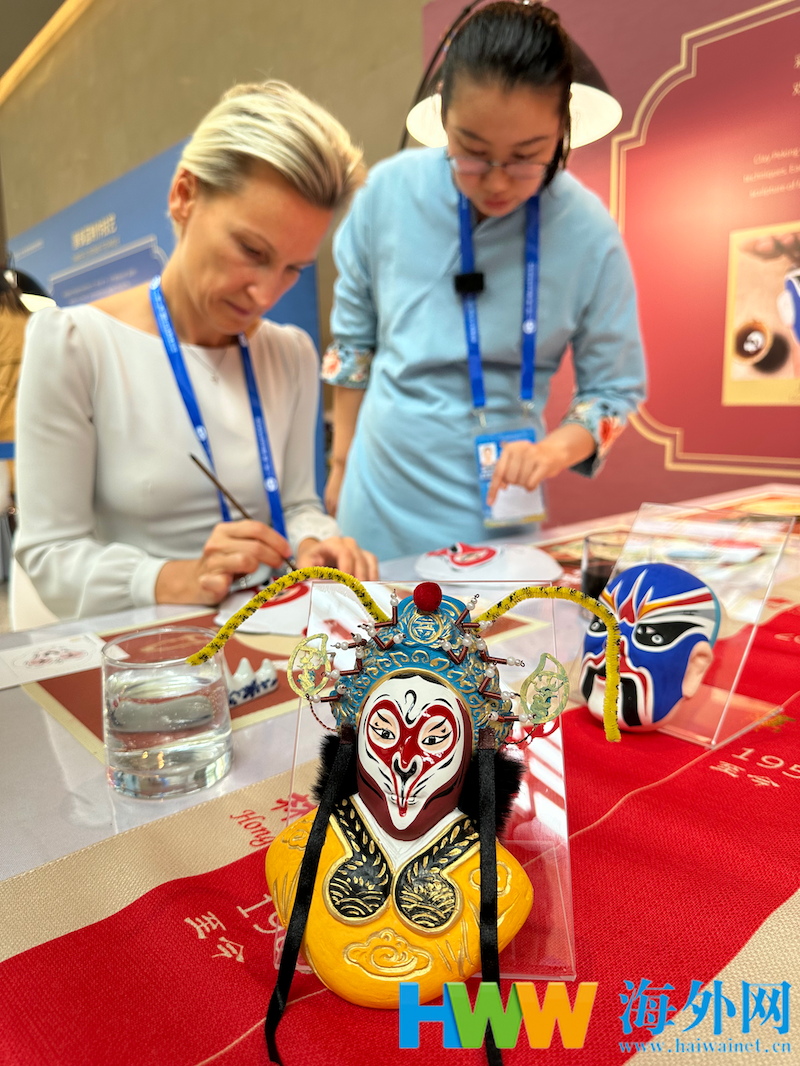 金砖国家女性工商联盟俄罗斯理事会主席安娜·涅斯特洛娃在第三届“一带一路”国际合作高峰论坛现场绘制脸谱画(海外网 牛宁/摄)