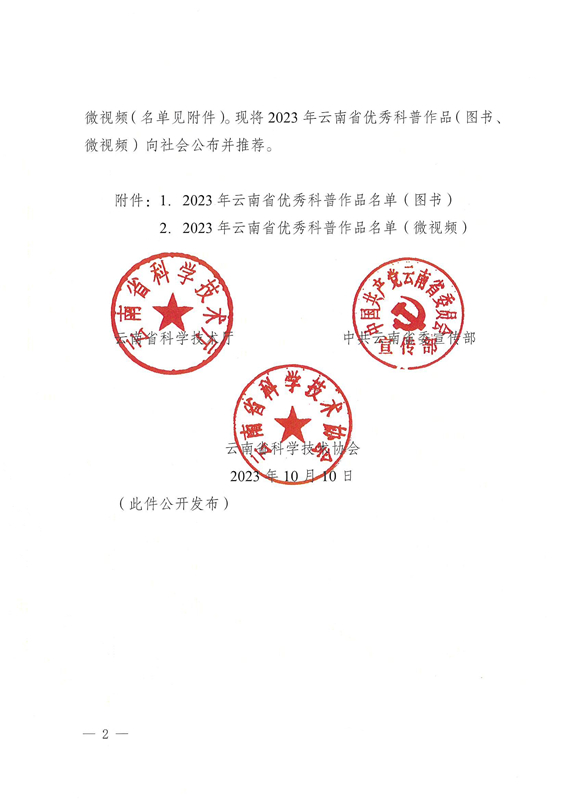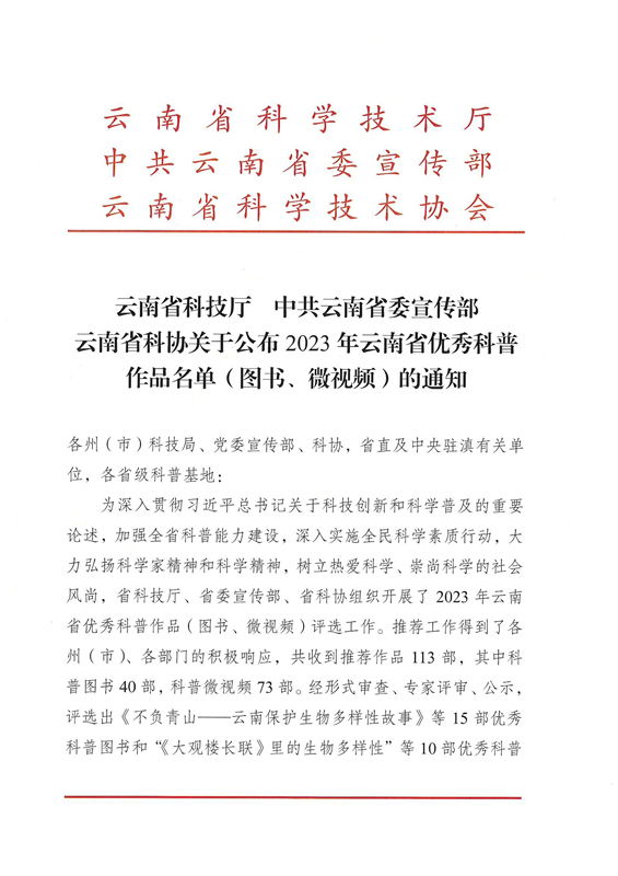 2023年云南省优秀科普作品(图书、微视频)评选共收到推荐作品113部,其中科普图书40部,科普微视频73部。经形式审查、专家评审、公示,评选出15部优秀科普图书和10部优秀科普微视频。其中,云南省妇幼保健院为普及国家三孩政策和再生育妇女优生优育知识,提高人口素质的科普视频《国家三孩政策好 科学生育不能少》荣获2023年云南省优秀科普作品。