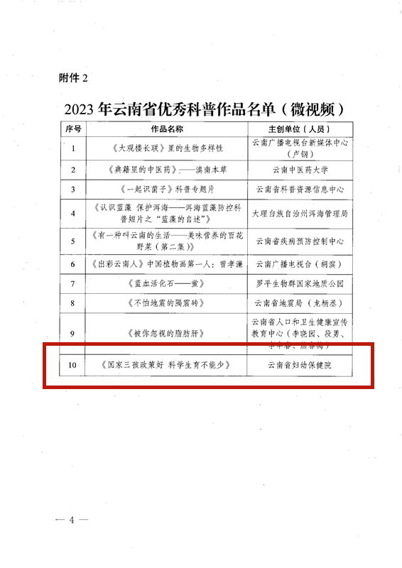 10月16日,云南省科技厅、中共云南省委宣传部、云南省科协公布2023年云南省优秀科普作品名单,云南省妇幼保健院《国家三孩政策好 科学生育不能少》科普微视频荣获2023年云南省优秀科普作品。