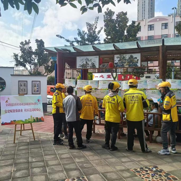 为进一步深化新业态新就业群体关心关爱工作,根据“盘龙小哥”流动性大的特点,金辰街道金实社区聚焦新业态新就业群体最关心、最直接、最现实的需求,再出服务“新”招,10月20日下午,在昆明市盘龙区金辰街道的金实路悬壶水景公园里,正在开展一场名为“党建赋能强就业,社区送岗暖骑心”的专场招聘会。