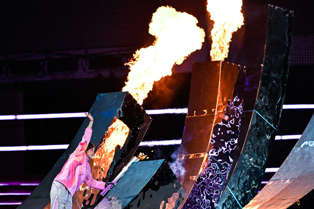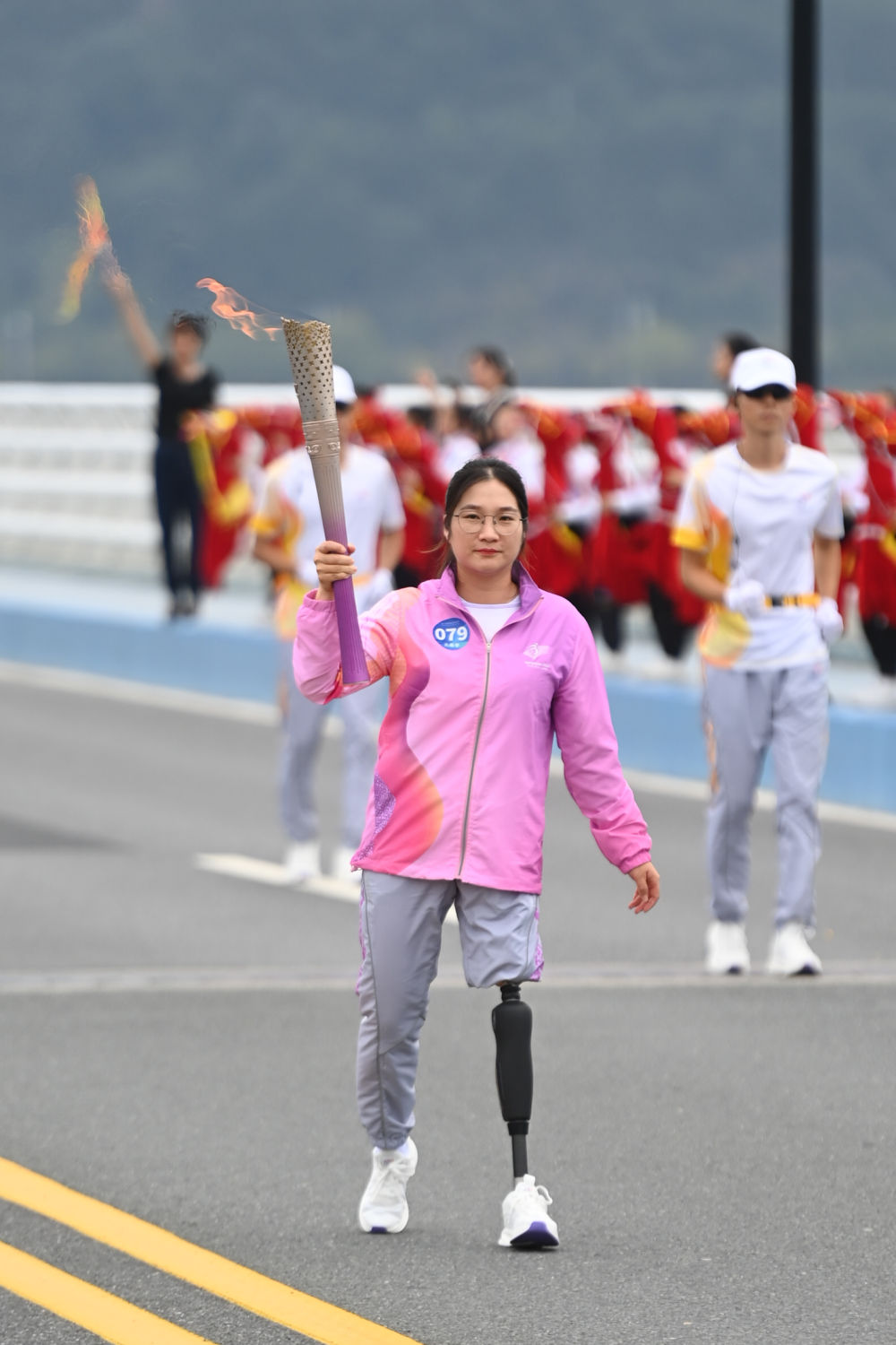 ↑在淳安的火炬传递活动中,智能导盲犬引导第13棒火炬手、视障姑娘蔡琼卉入场并完成传递。