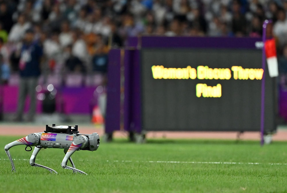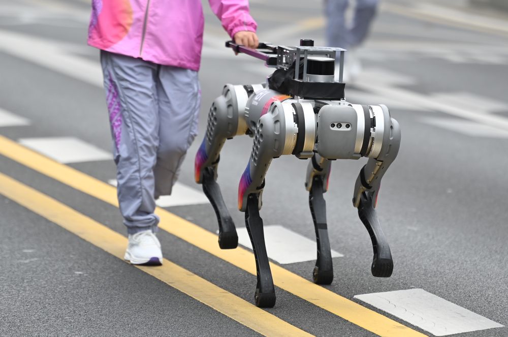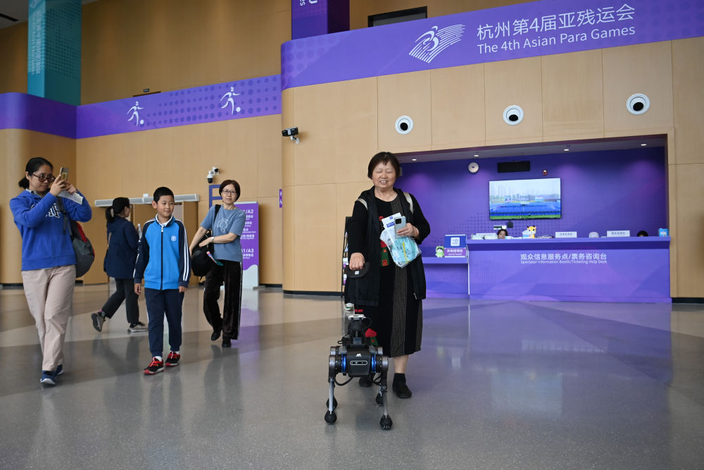 ↑智能导盲犬在杭州亚残运会火炬传递过程中亮相。