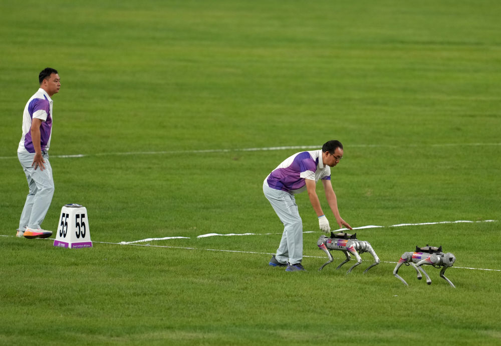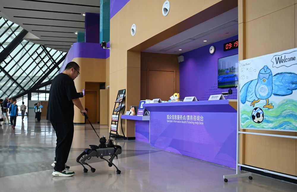 ↑电子导盲犬“小西”在举办杭州亚残运会盲人足球项目比赛的拱墅运河体育公园体育场进行志愿服务。