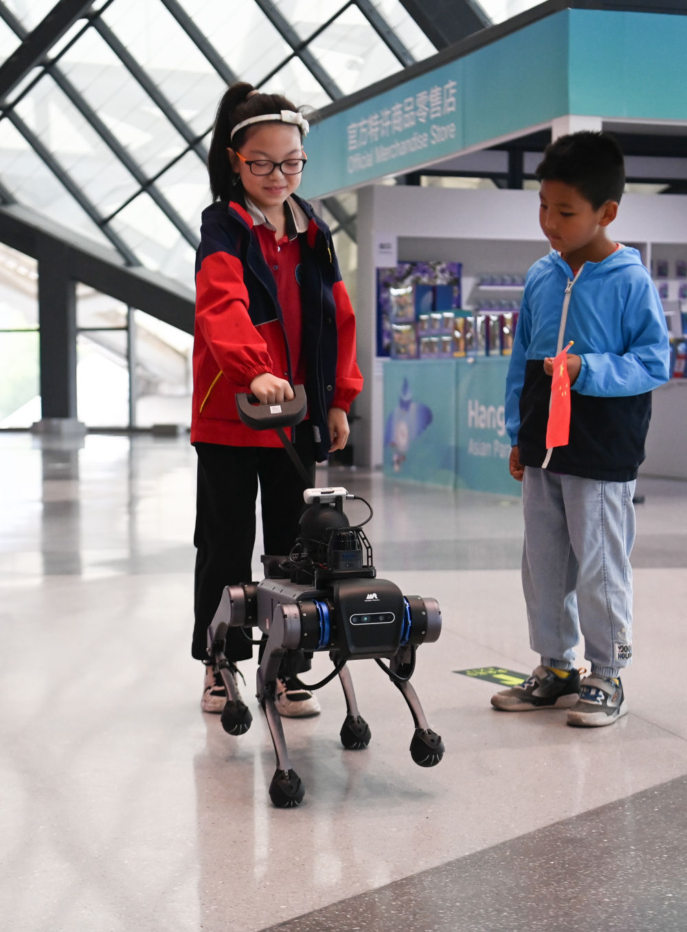 ↑观众在拱墅运河体育公园体育场大厅体验电子导盲犬“小西”的服务。